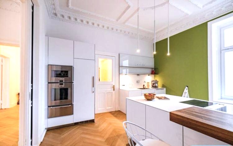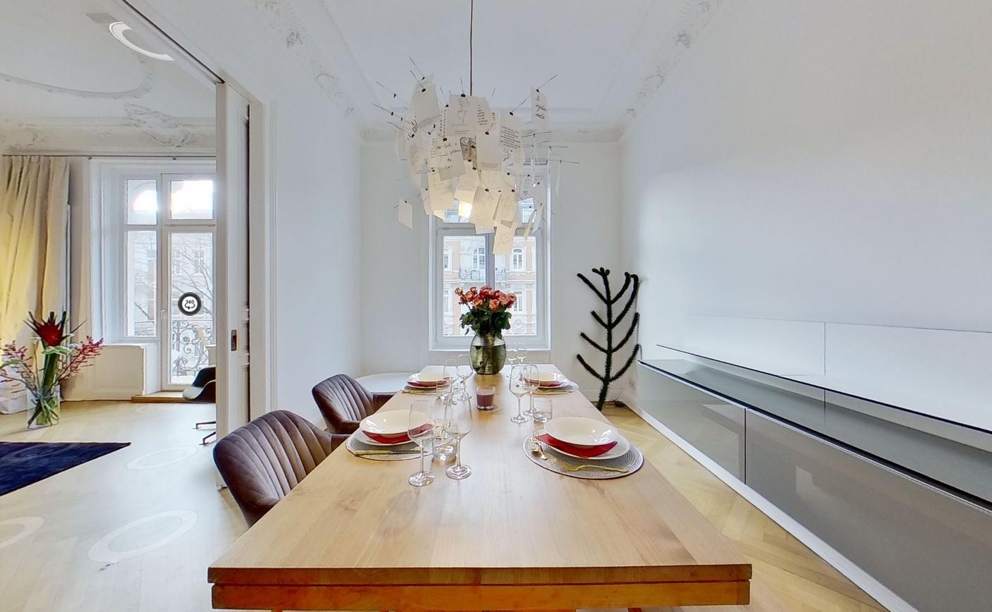 Der Grundriss bietet viel Spielraum für Familie, Home-Office, oder repräsentatives Wohnen. Ein großzügiger Empfangsbereich öffnet die klassisch proportionierten, angrenzenden Räume. Zur Straßenseite liegen drei Zimmer – wovon zwei ineinander übergehen und als Esszimmer und Wohnzimmer genutzt werden. Hier befindet sich der Zugang zum kleineren Balkon, Richtung Straße. Stilvolle Schiebetüren verbinden harmonisch den Wohn- und Essbereich sowie die Wohnküche und schaffen eine elegante Raumstruktur. Das moderne Design der Küche, die hochwertige Qualität sowie die Gaggenau Markengeräte, erfüllen höchste Ansprüche an Funktionalität und Ästhetik.